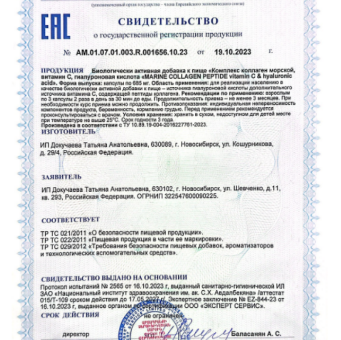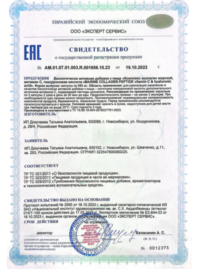 Состав 6 кап. (суточная дозировка), мг: Коллаген морской - 3810, L-аскорбат кальция (витамин С) - 150, гиалуроновая кислота - 120, оболочка капсулы (гидроксипропилметилцеллюлоза).